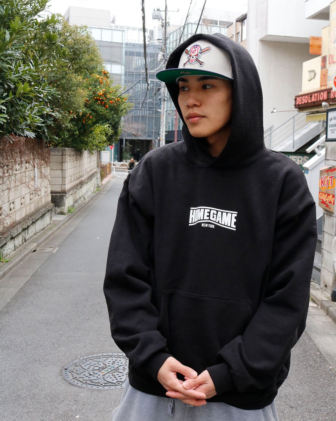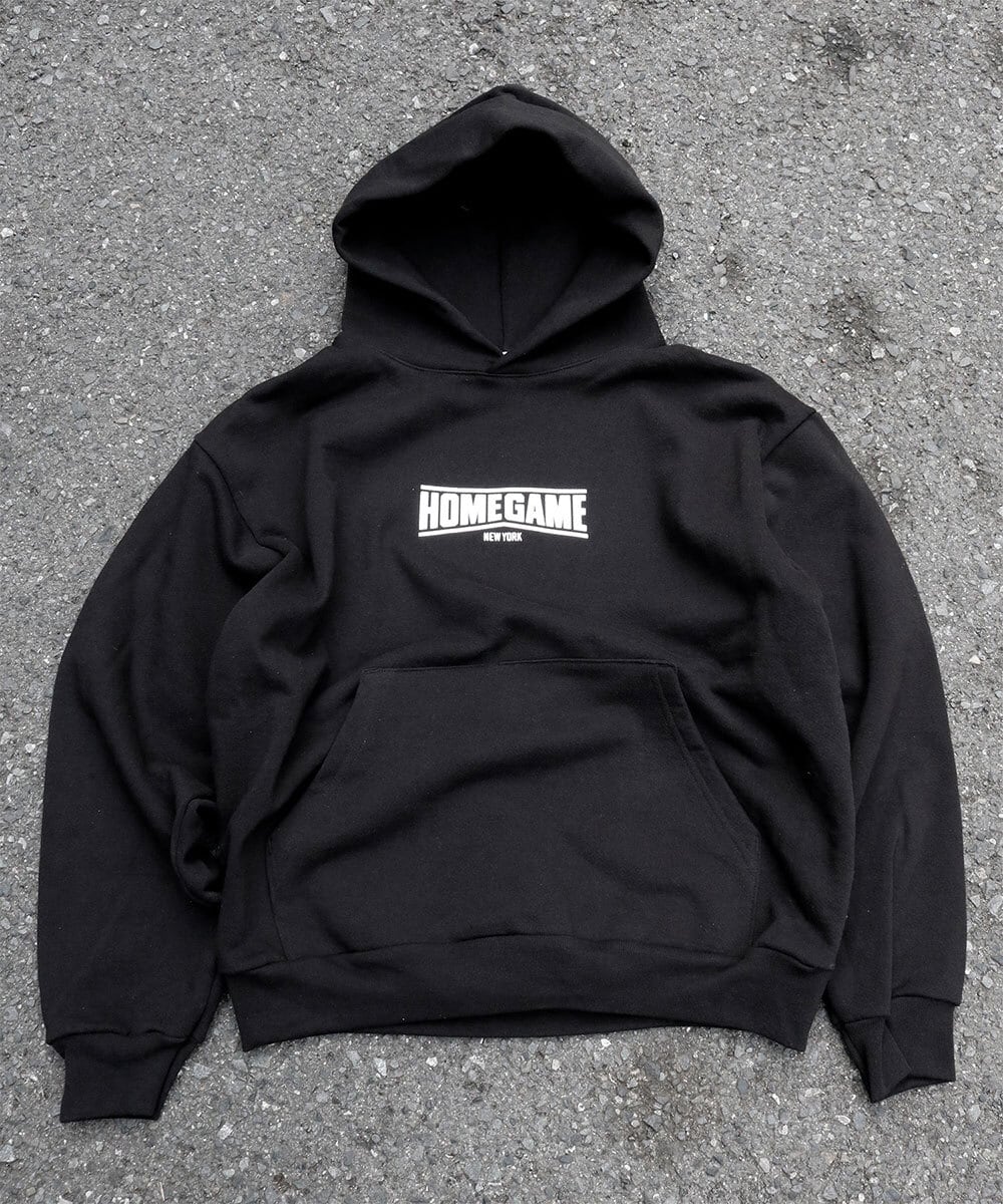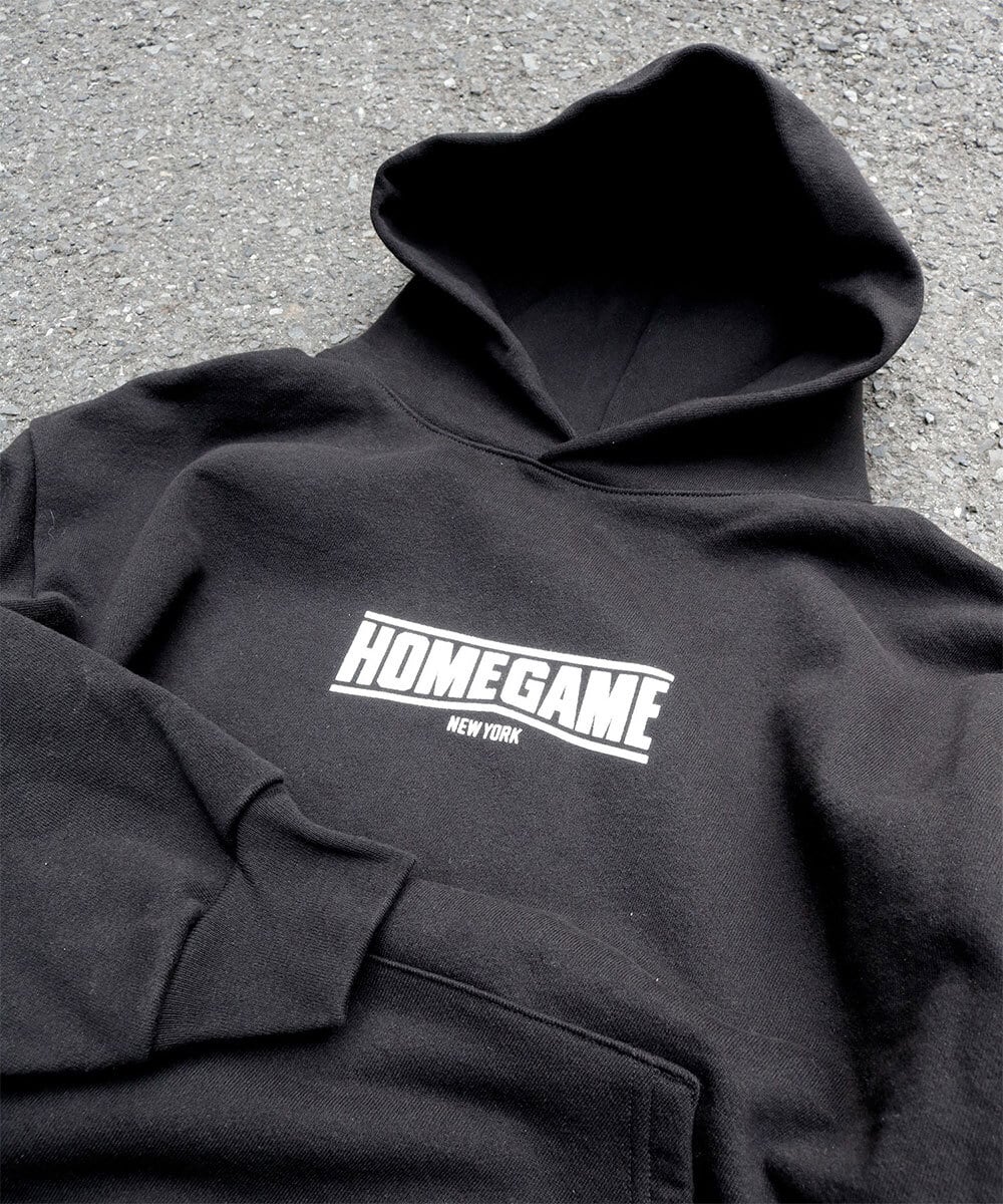 HOMEGAME NEW YORKロゴがラバープリントされたプルオーバーパーカー。